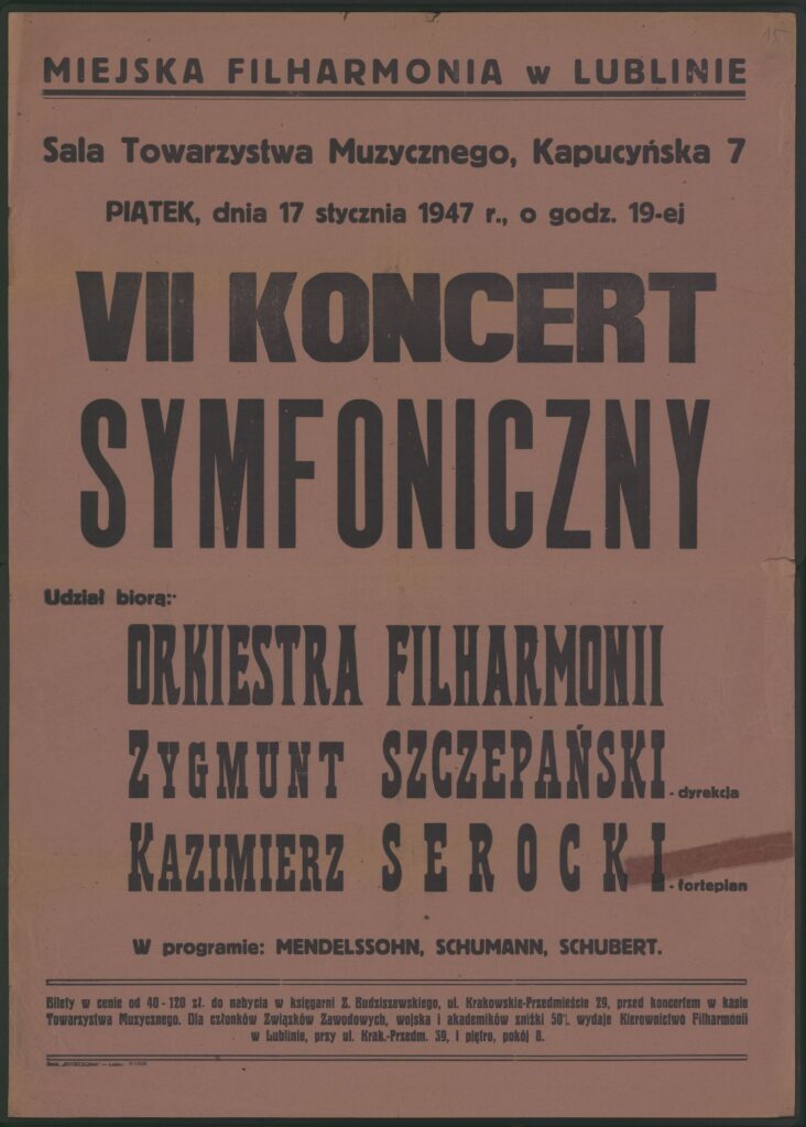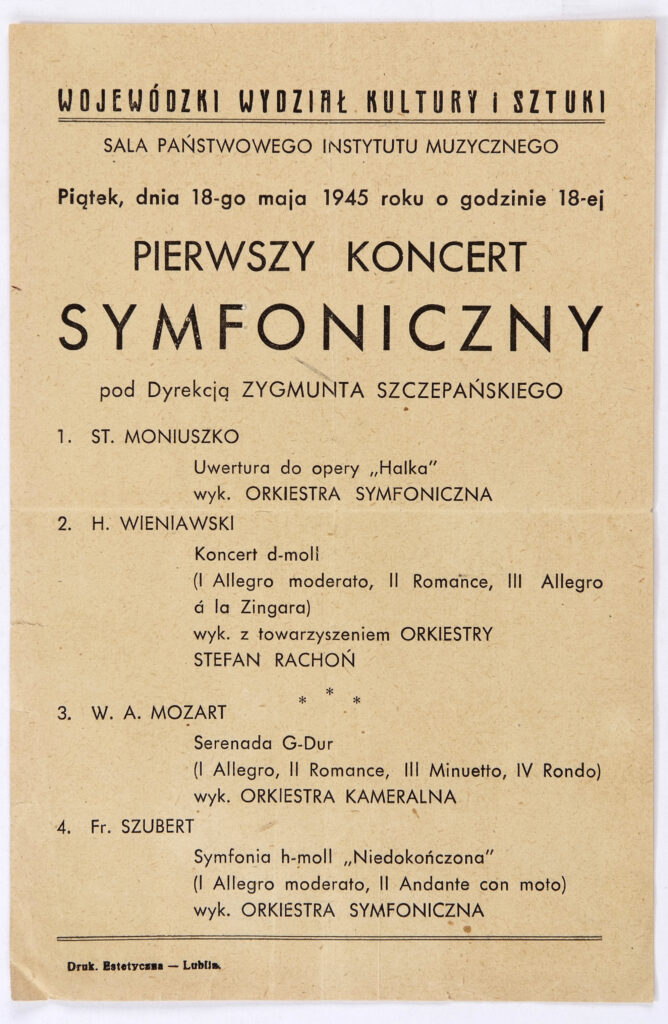 Pierwszy koncert zespół dał 10 lutego 1945 roku, jeszcze podczas wojny. Lubelską Orkiestrę Kameralną, przekształconą w 1946 w Miejską Filharmonię w Lublinie. Pierwszym Dyrektorem Filharmonii został Jan Widmański, a stałym dyrygentem i kierownikiem artystycznym, jej dotychczasowy organizator, Zygmunt Szczepański. Przed końcem sezonu artystycznego 1946/47, Zygmunt Szczepański zrezygnował ze swojego stanowiska i opuścił Lublin. Dyrektorem pozostał nadal Jan Widmański, a kierownictwo artystyczne objął Adam Wyleżyński.